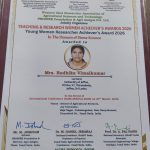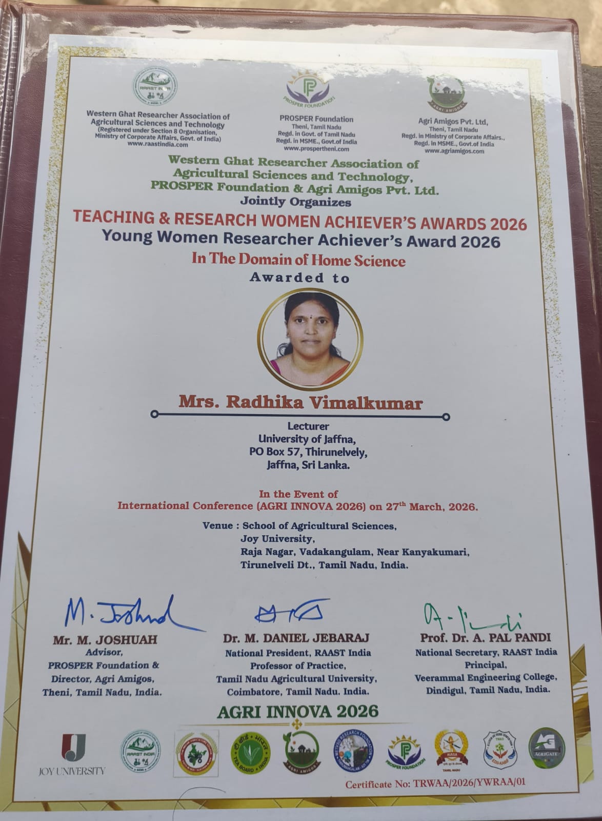 Mrs. Radhika Vimalkumar, Lecturer (Confirmed) of the Home Economics Unit, Faculty of Arts, University of Jaffna, was honored with the Teaching and Research Women Achiever’s Award in Home Science, a prestigious accolade presented at AGRI INNOVA 2026 2026 held on 27.03.2026 at Joy University, Kanyakumari, India